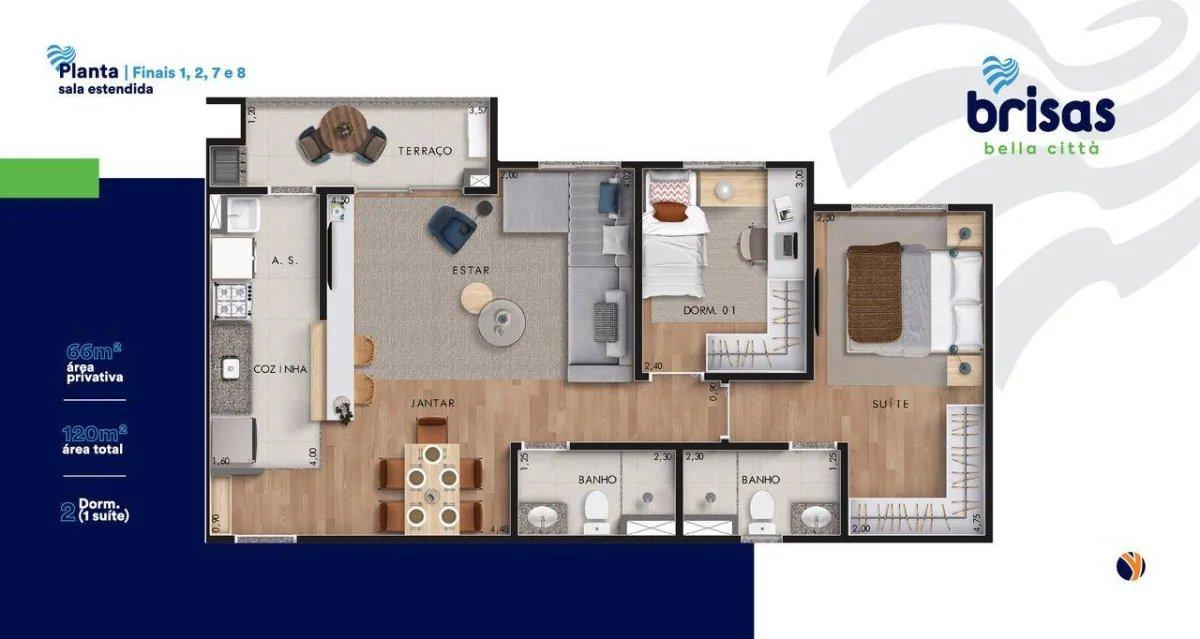 Os apartamentos, com 66m² privativos, apresentam plantas flexíveis de 3 dormitórios ou 2 dormitórios com sala estendida, todos acompanhados por sacada com churrasqueira para momentos de lazer exclusivos.
