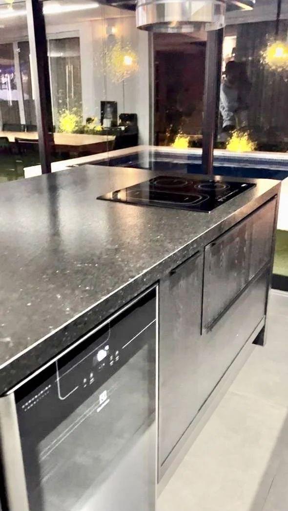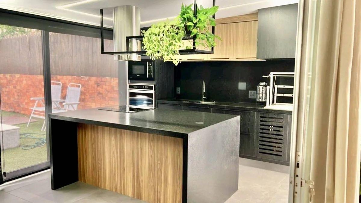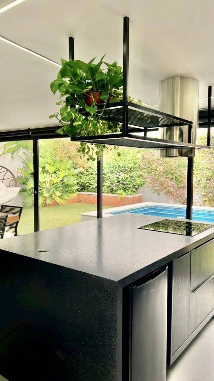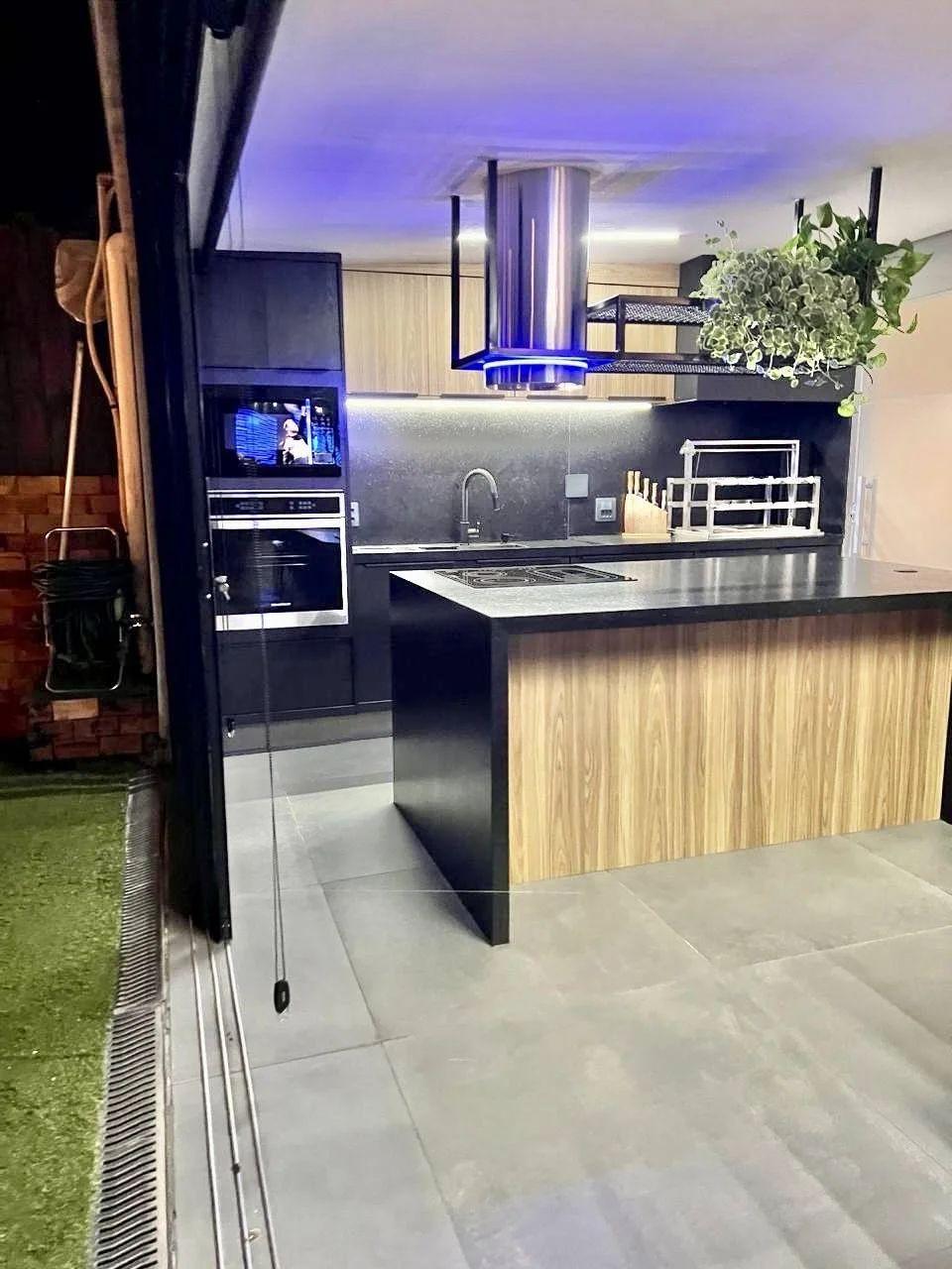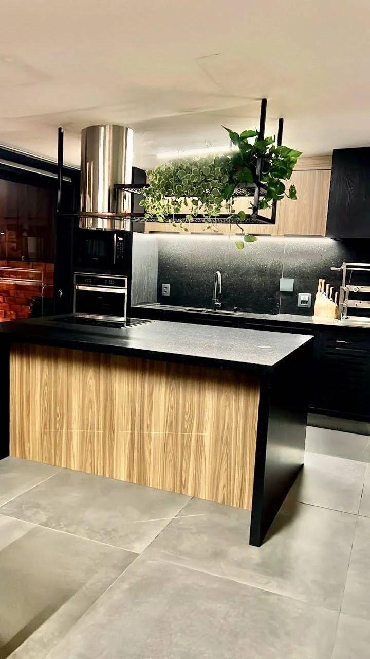 Ilha central preta fosca: Equipado com cooktop, coifa moderna, armários planejados, torre de tomadas e espaço para frigobar.