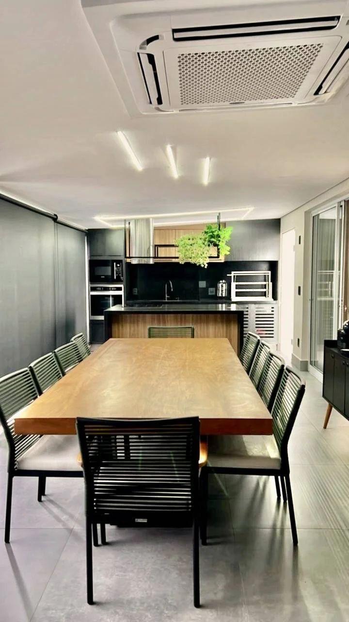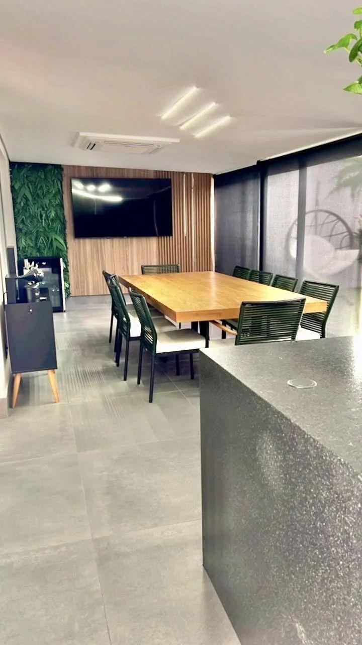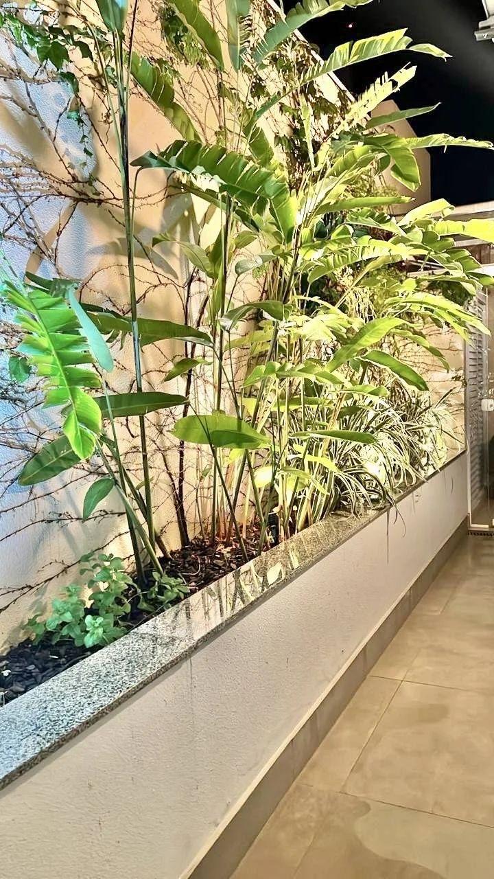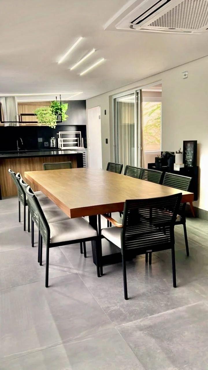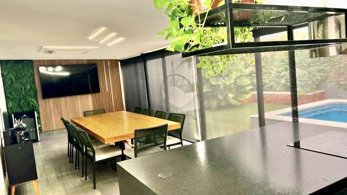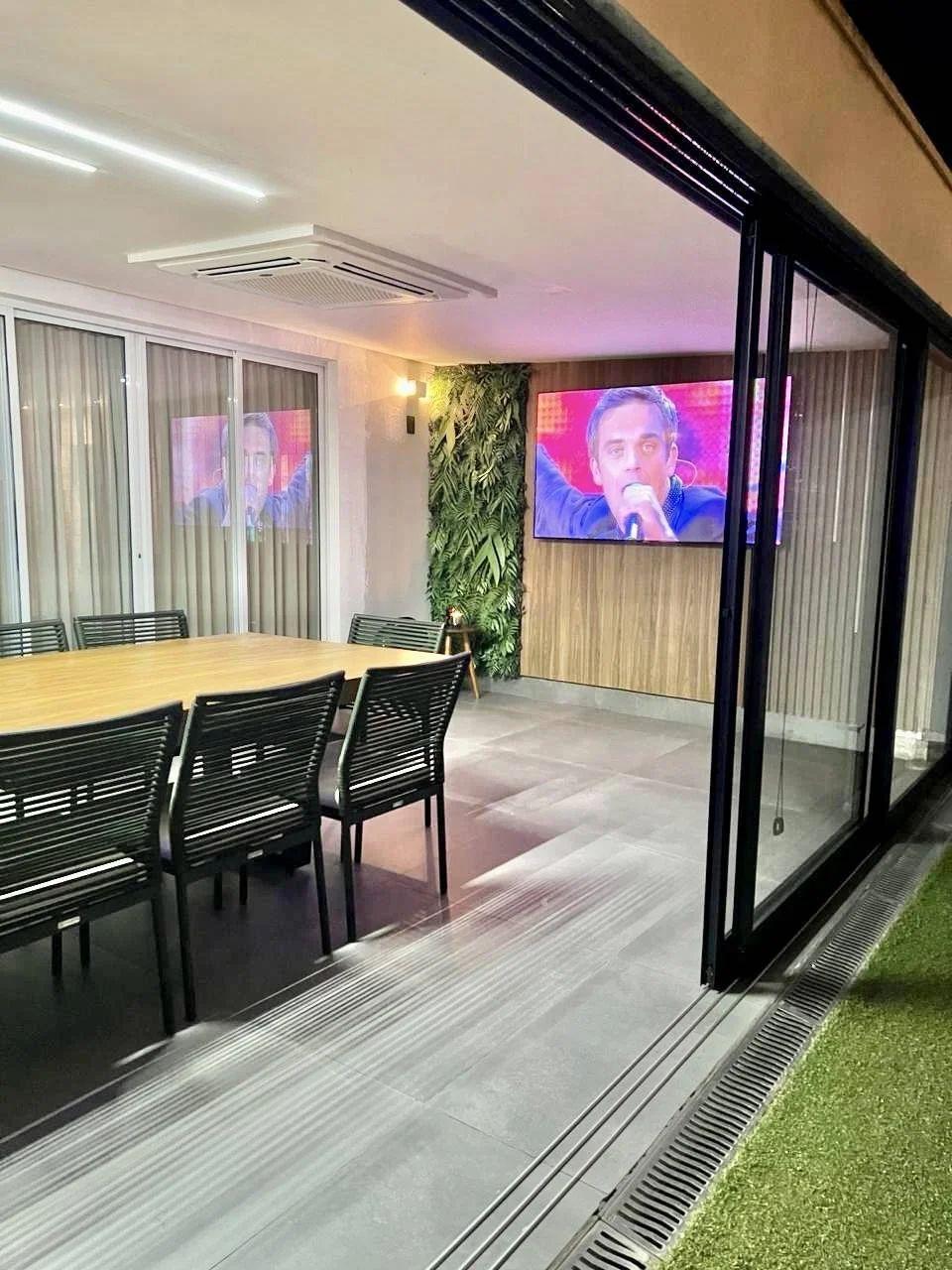 Climatização e lazer externo: Ar-condicionado grande no gourmet, que se conecta ao amplo quintal com piscina aquecida por serpentina, além de lindas plantas que completam o ambiente.
