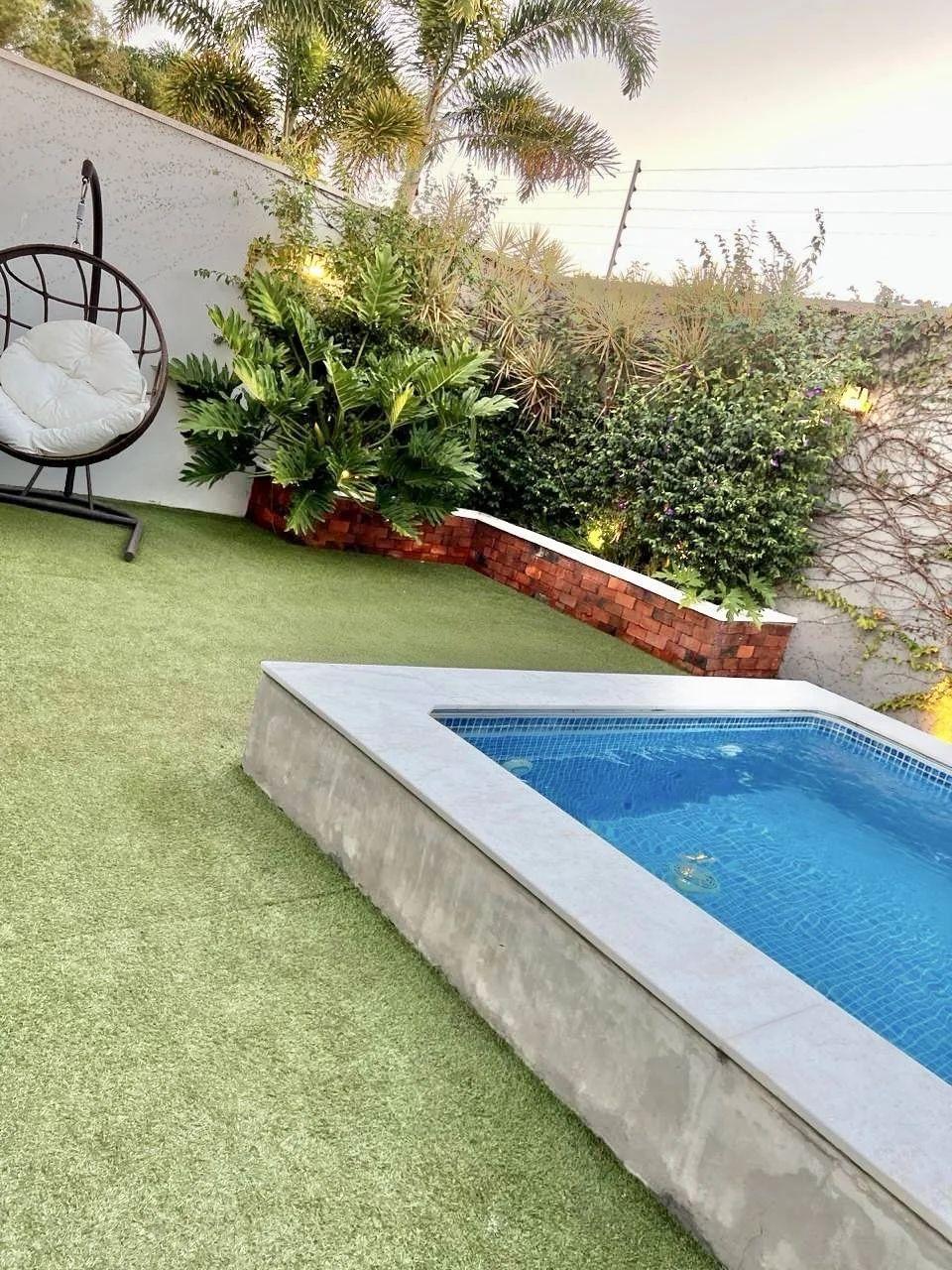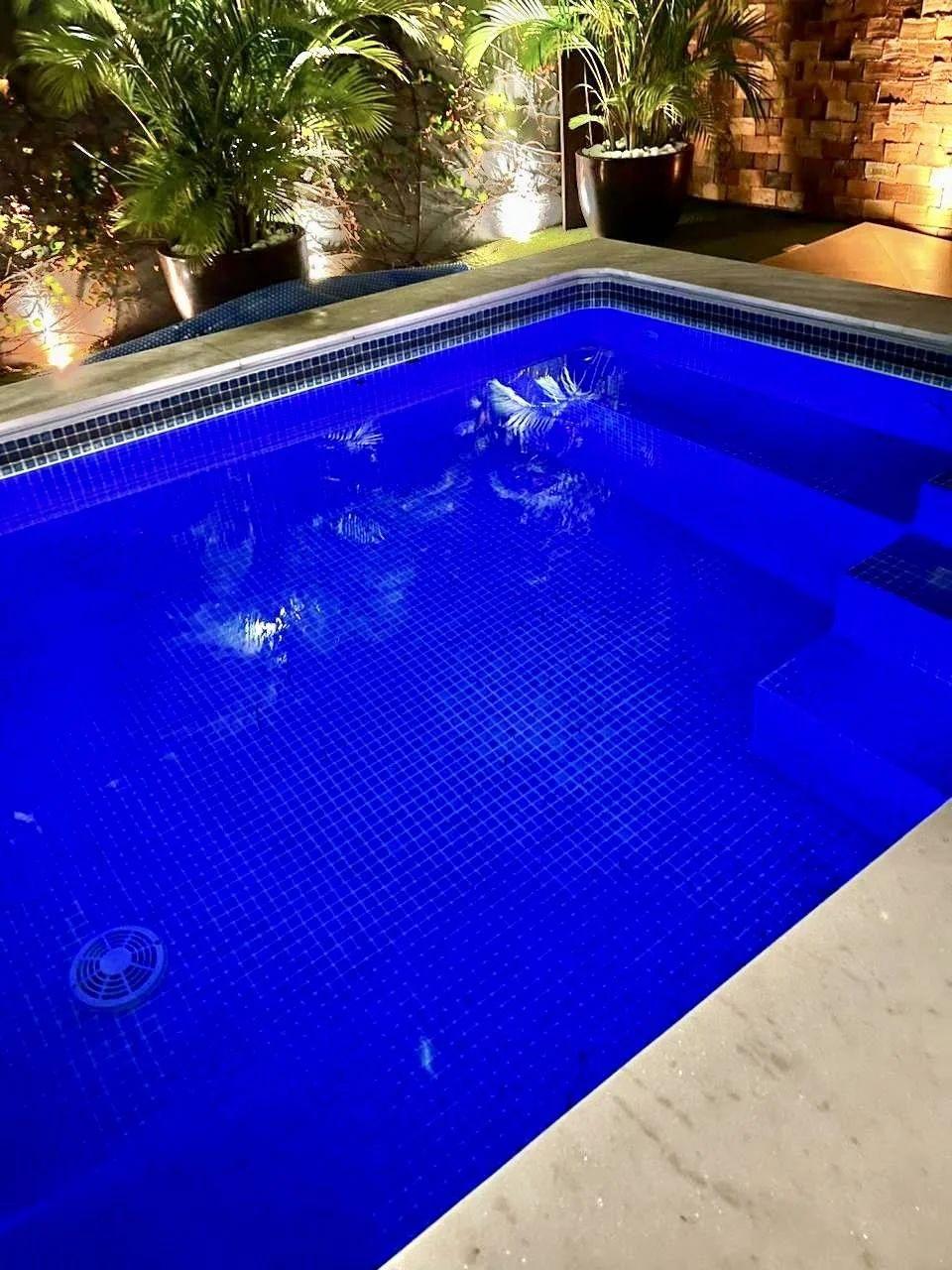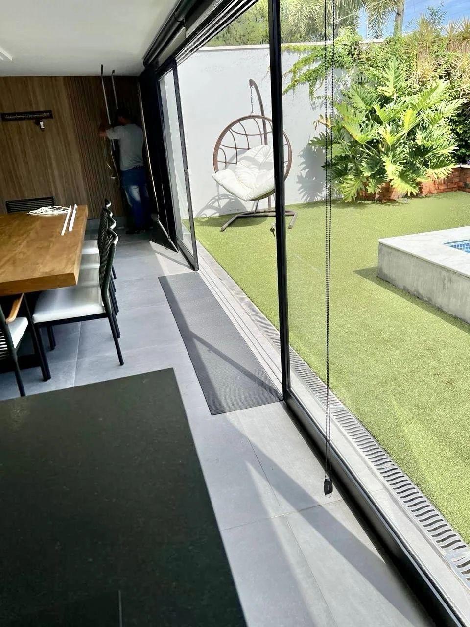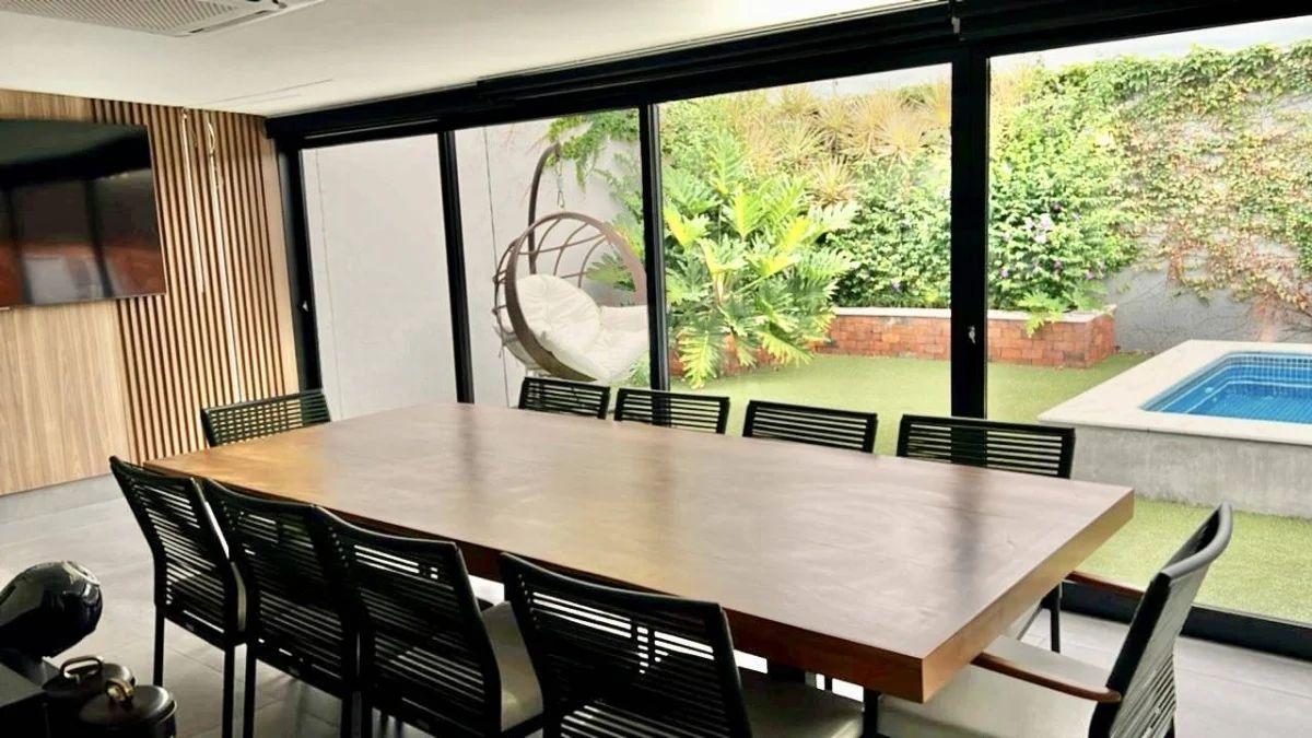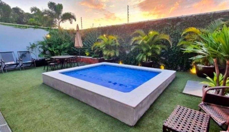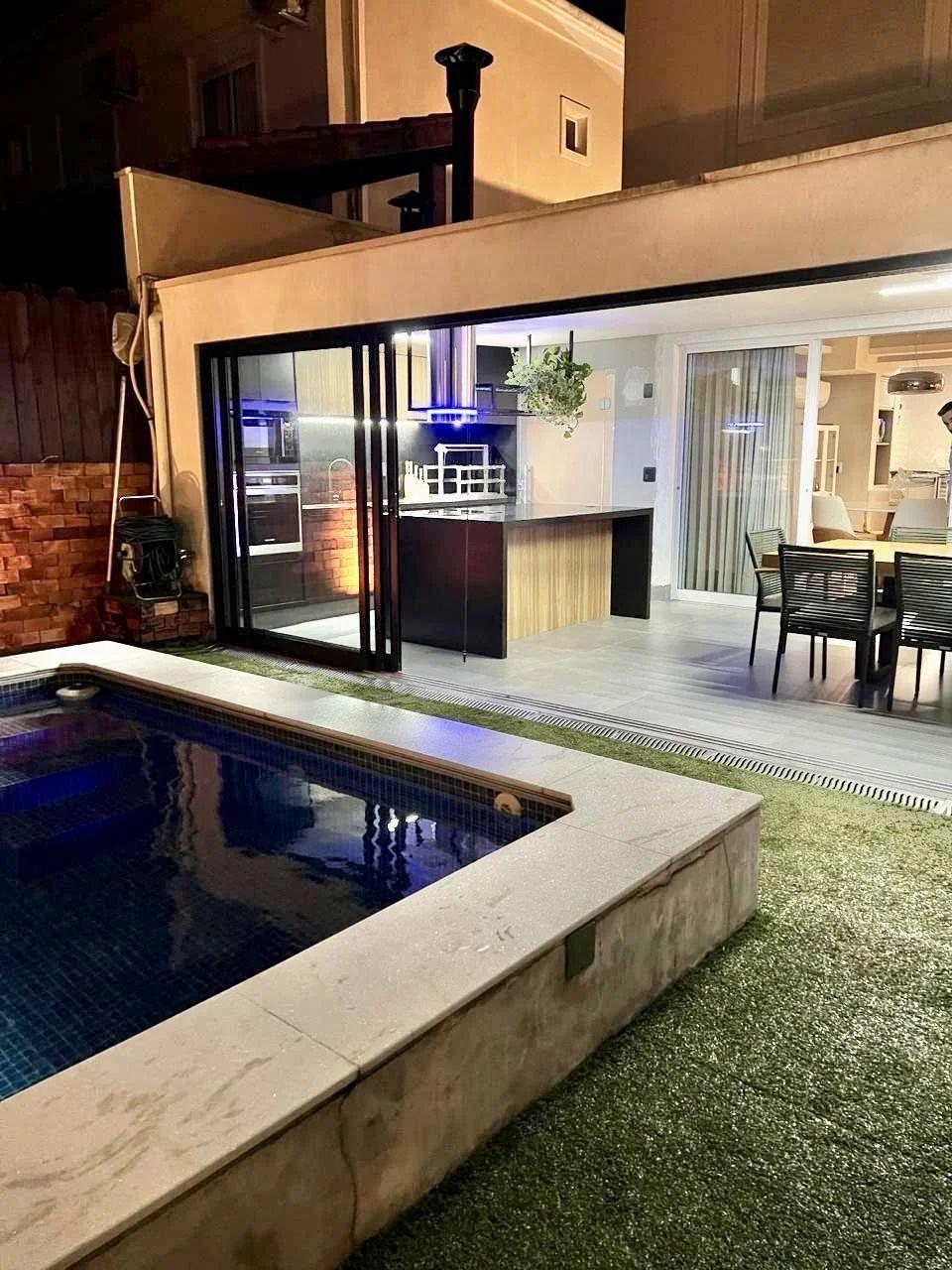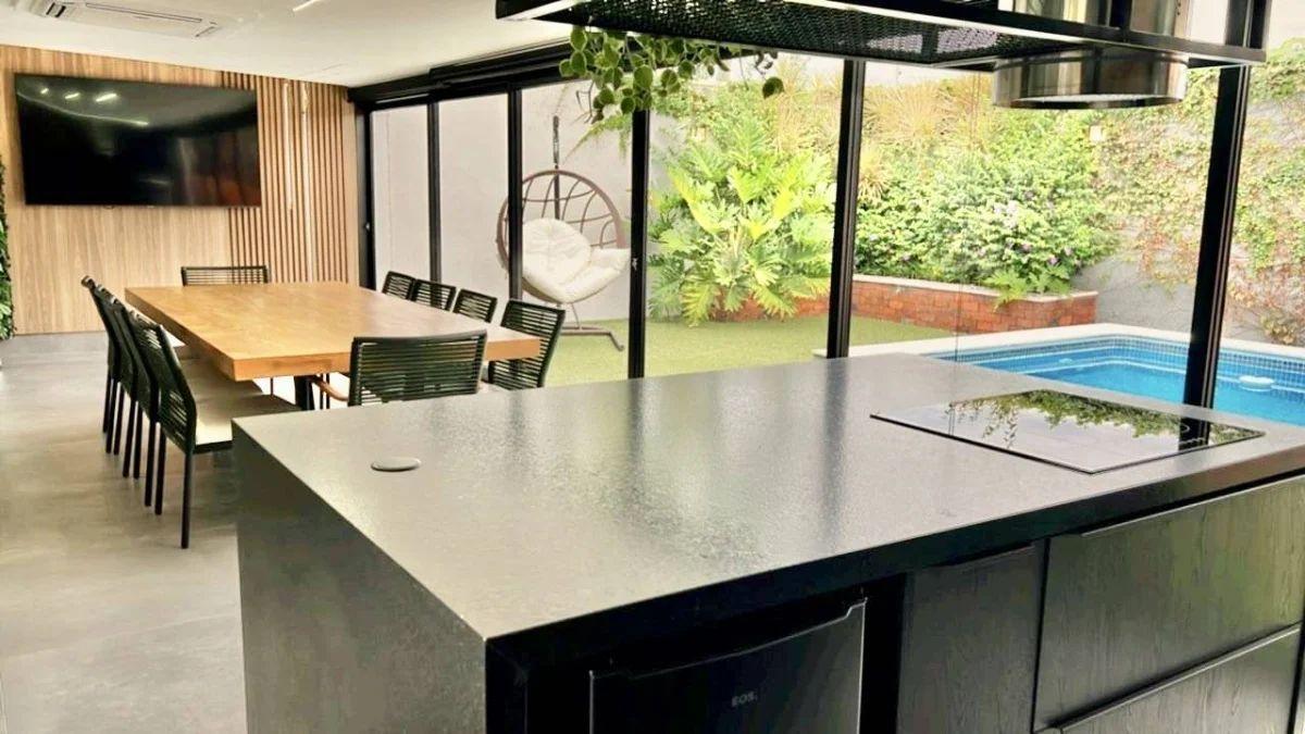 Climatização e lazer externo: Ar-condicionado grande no gourmet, que se conecta ao amplo quintal com piscina aquecida por serpentina, além de lindas plantas que completam o ambiente.