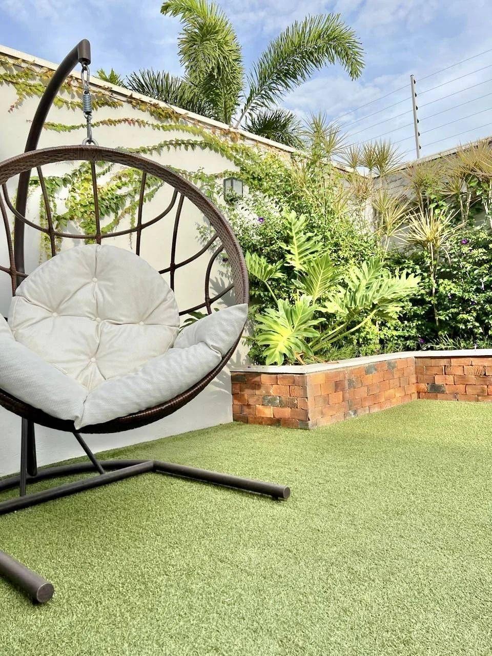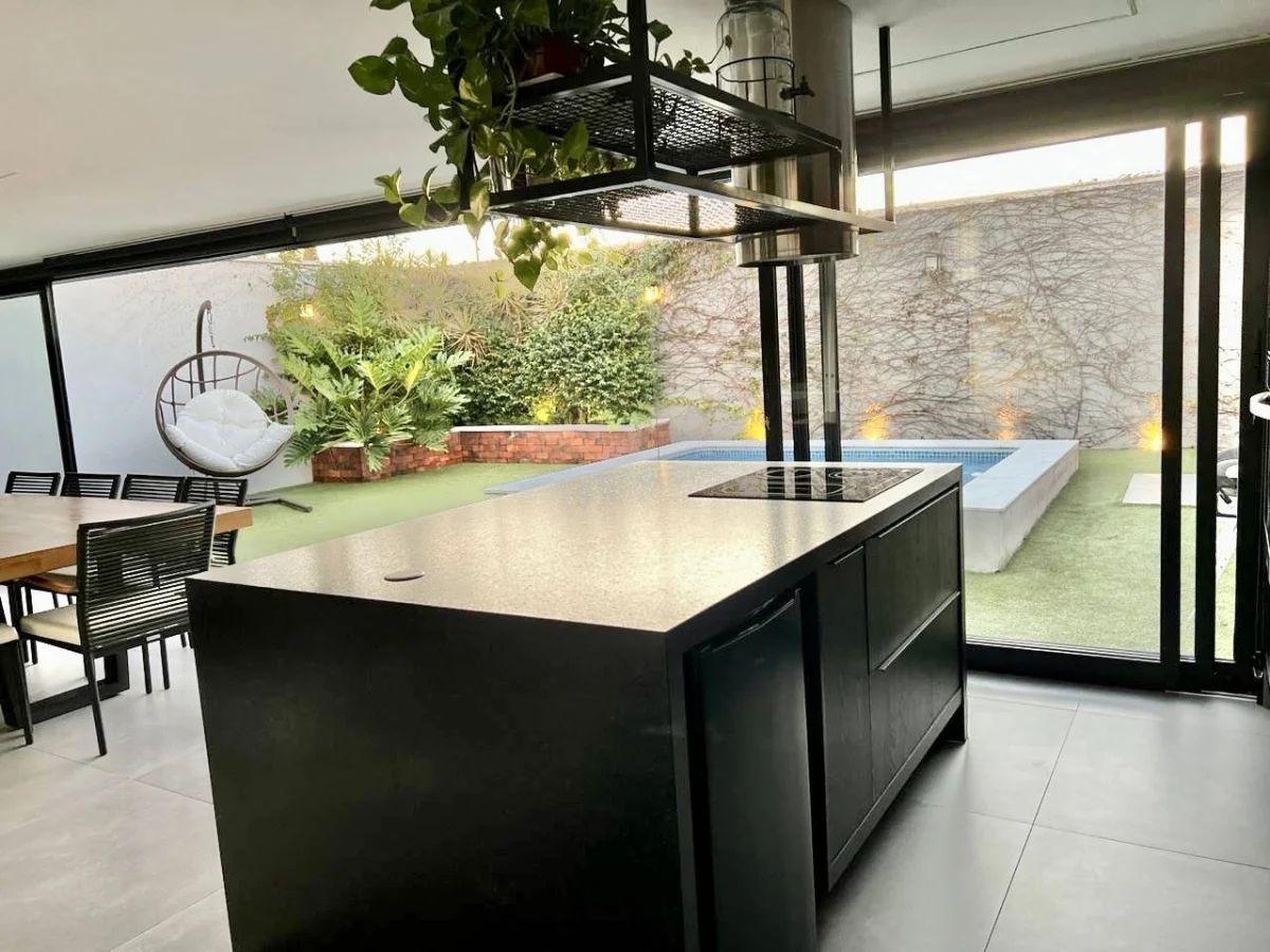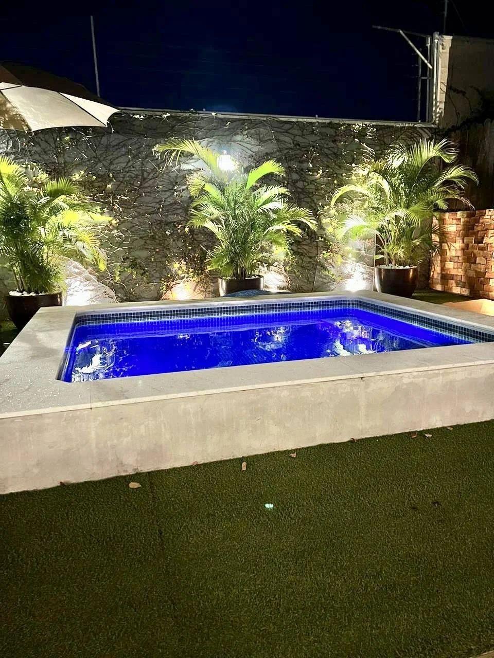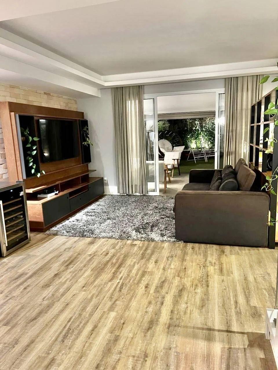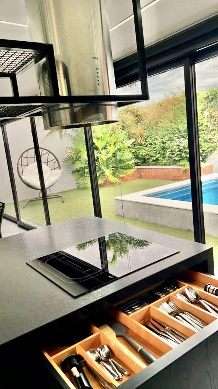 Climatização e lazer externo: Ar-condicionado grande no gourmet, que se conecta ao amplo quintal com piscina aquecida por serpentina, além de lindas plantas que completam o ambiente.
