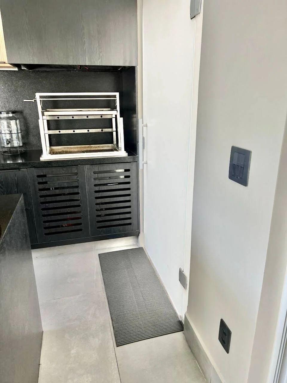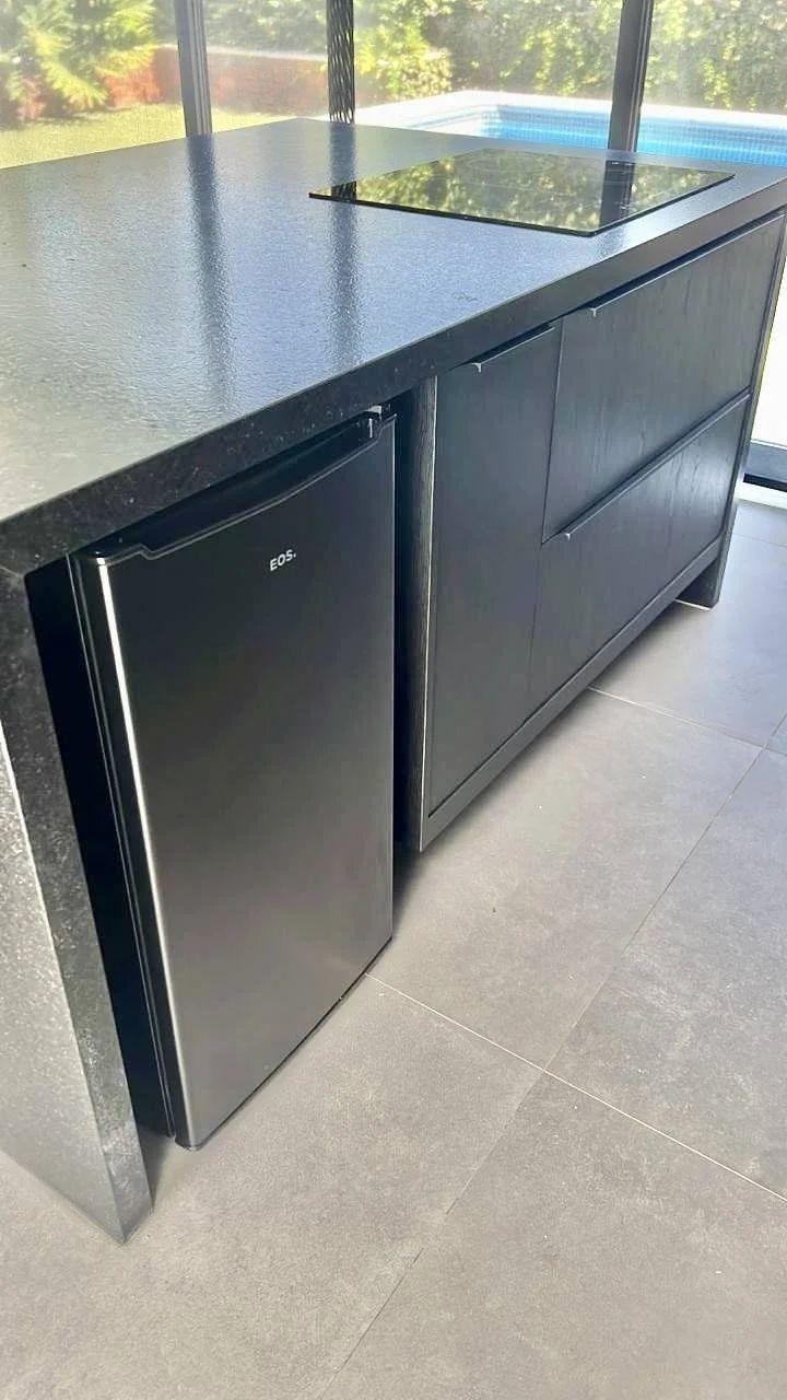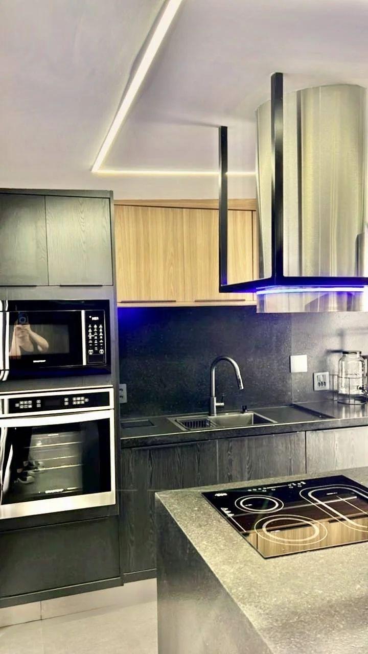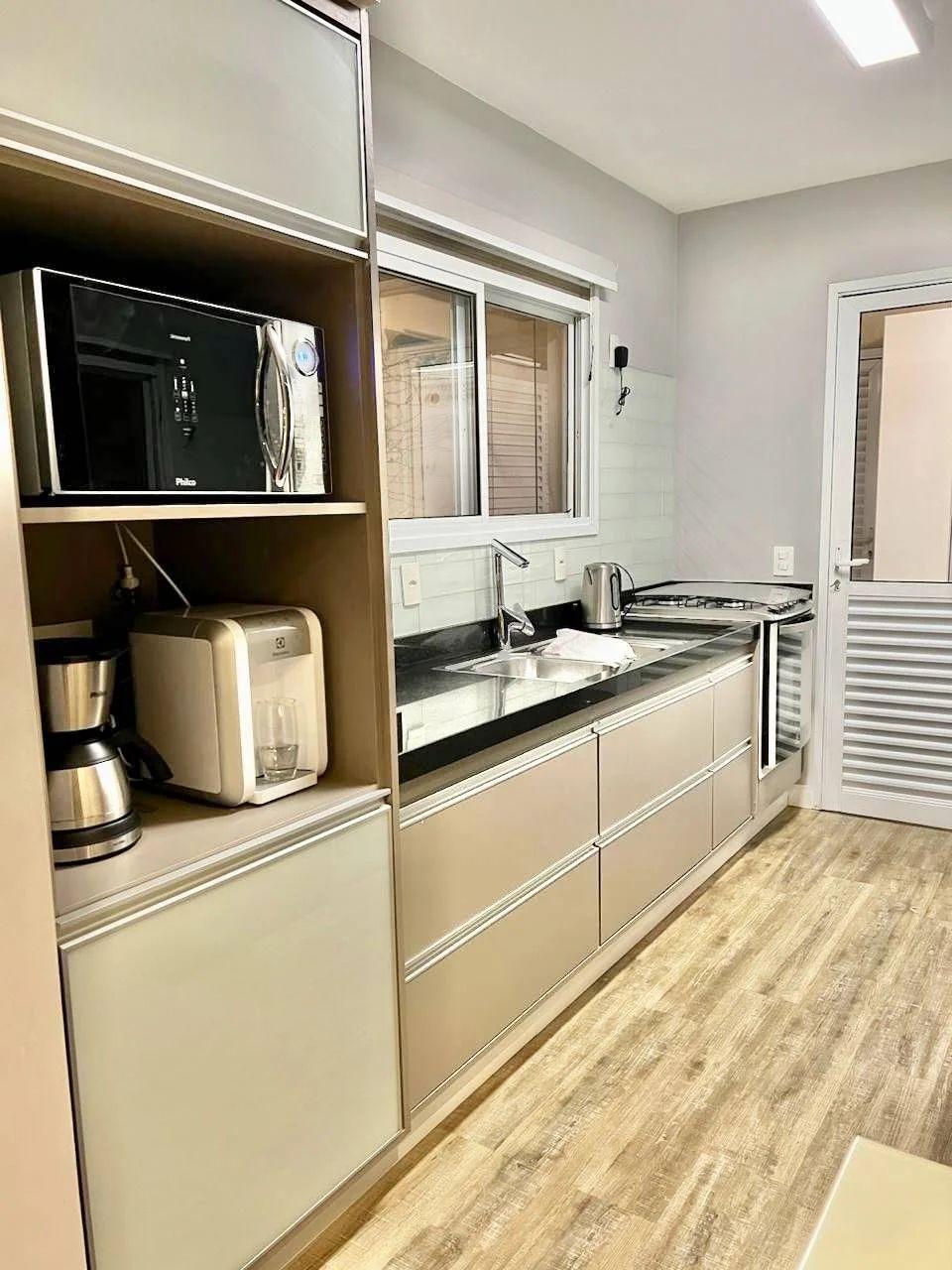 Bancada com pia: Inclui forno elétrico, micro-ondas e churrasqueira com exaustor embutidos.